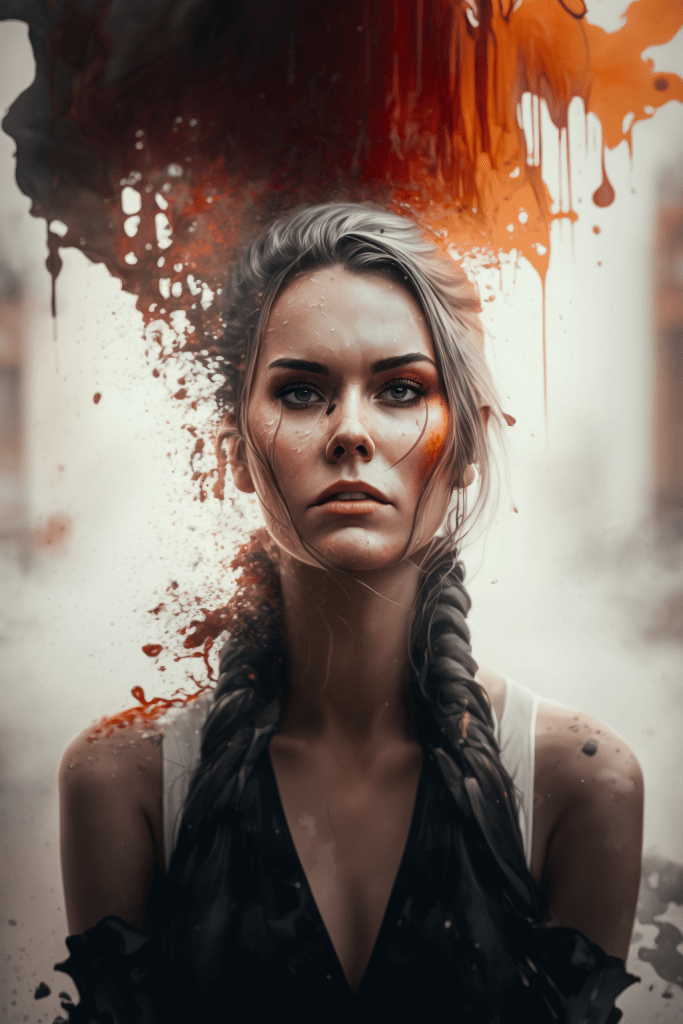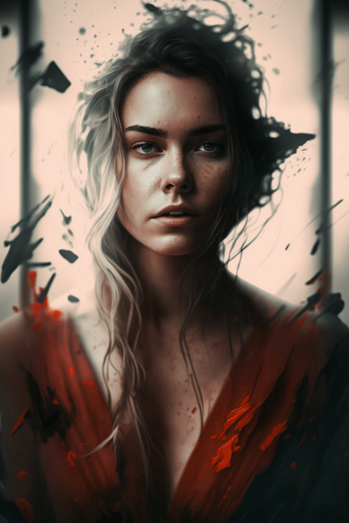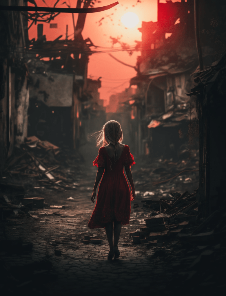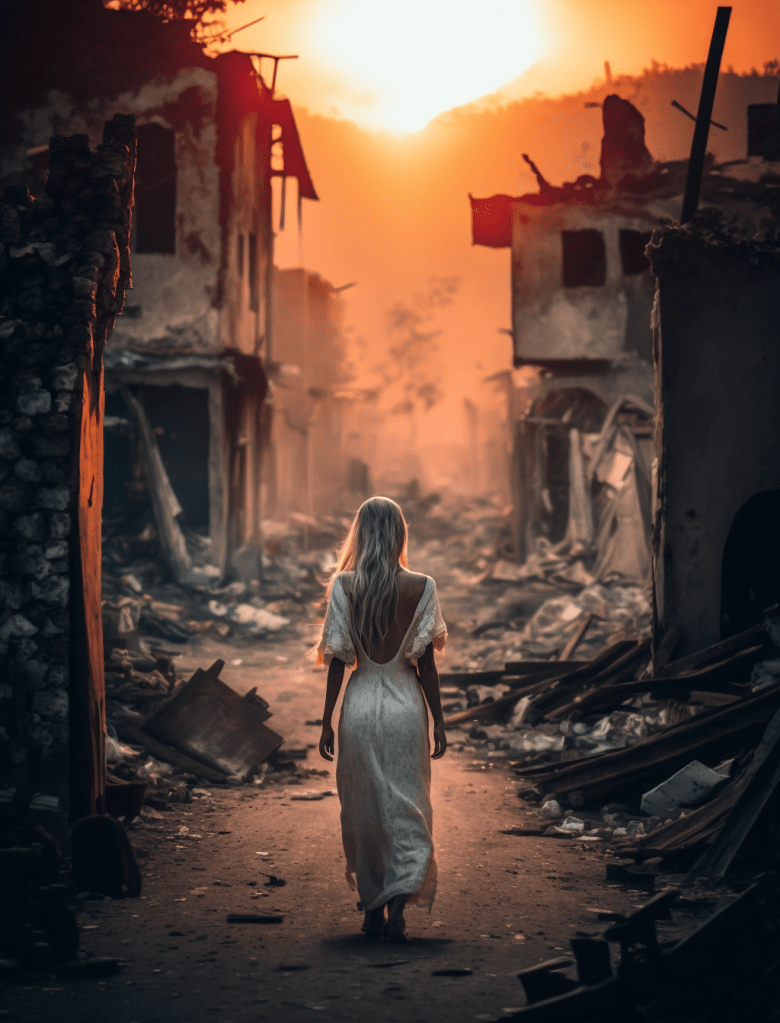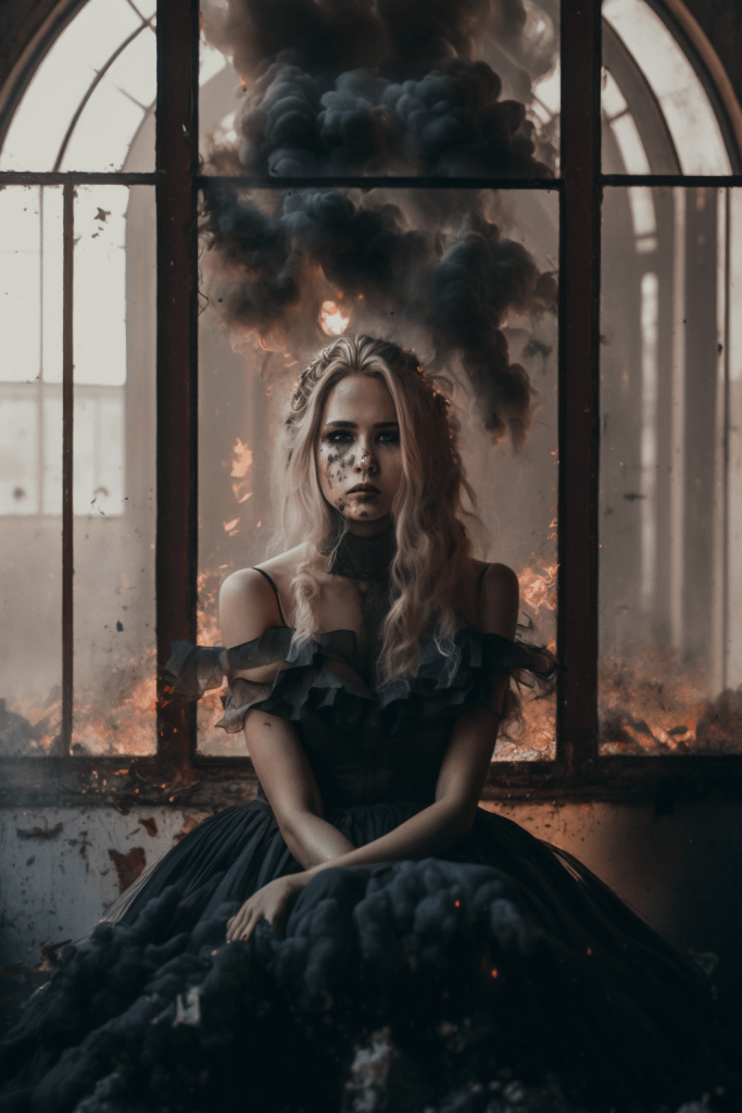Yet, even amidst devastation, hope and resilience can rise like a phoenix. This is the driving force behind „Rebirth through Transformation,“ an evocative and compelling artwork series that encapsulates the human spirit’s innate ability to rise from the ashes and embrace a new beginning. In each image, there is a glimmer of hope, a reminder that even in the darkest of times, the human spirit can endure. This glimmer of hope is depicted by a young woman wearing a dress and finding herself amidst the destruction, exuding a calm and contemplative mood. Her face bears an expression of quiet strength and resilience, coupled with determination and resolve. She appears to be embracing the truth, finding hope, and remaining steadfast in her perseverance.